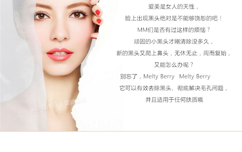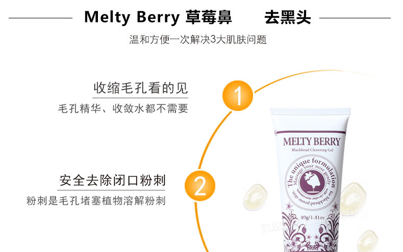 日本Melty Berry 草莓鼻去黑頭深層清潔收縮毛孔除角質(zhì)天然啫喱凝露40g ——1、清涼啫喱質(zhì)地。 2、清潔毛孔,去除黑頭。 |