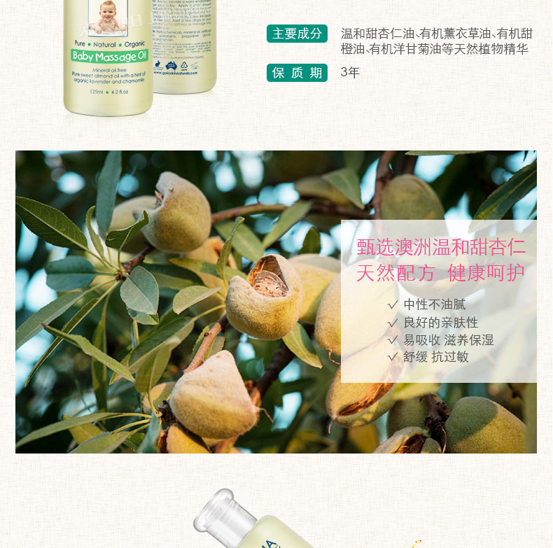 直郵澳大利亞GAIA嬰兒按摩油撫觸油親膚油125ml 來(lái)自澳洲的嬰兒“按摩師”—— 1、含甜杏仁油、薰衣草油、洋甘菊油及甜橙皮提取物等成分。 2、親膚易吸收,中性不油膩。 3、舒緩安撫、滋潤(rùn)抗敏、開(kāi)胃助消化。 |