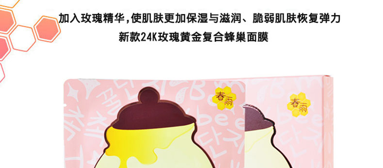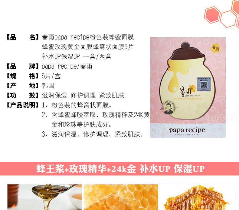 春雨papa recipe粉色裝蜂蜜面膜蜂蜜玫瑰黃金面膜蜂窩狀面膜5片 補水UP保濕UP—— 1、粉色裝蜂窩狀面膜。 2、含蜂蜜蜂膠萃取、玫瑰精粹及24K黃金和珍珠等護膚成分。 3、滋潤保濕、修護調理、緊致肌膚。 |