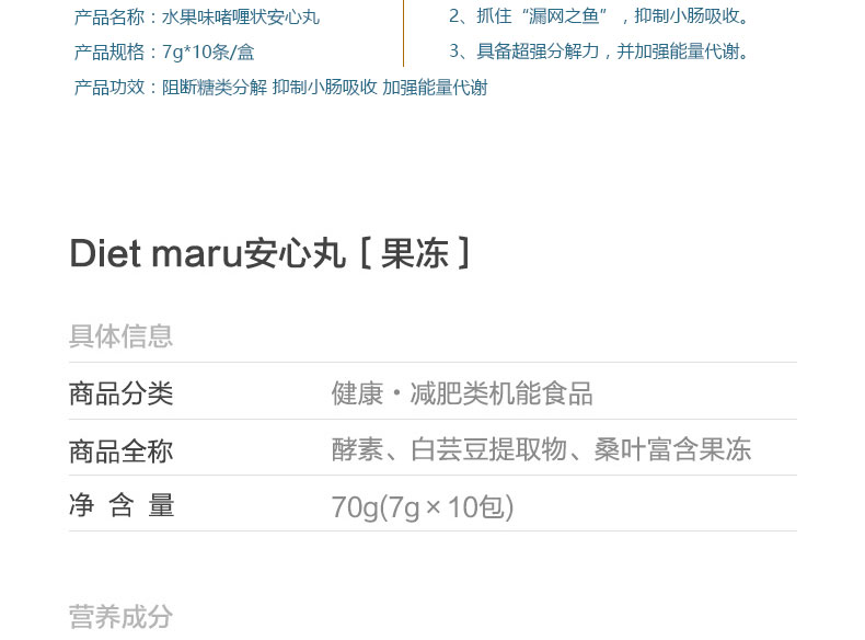 大目Diet Maru美食急救系列水果味啫喱狀安心丸7g*10條 讓你做一個狂吃不胖的死瘦子—— 1、阻斷94%以上的淀粉分解為糖類。 2、抓住“漏網(wǎng)之魚”,抑制小腸吸收。 3、具備超強分解力,并加強能量代謝。 |