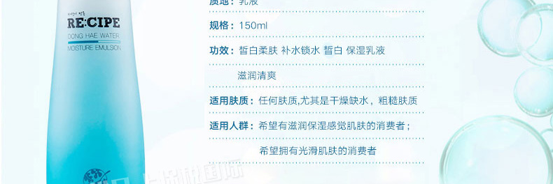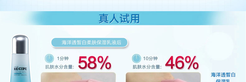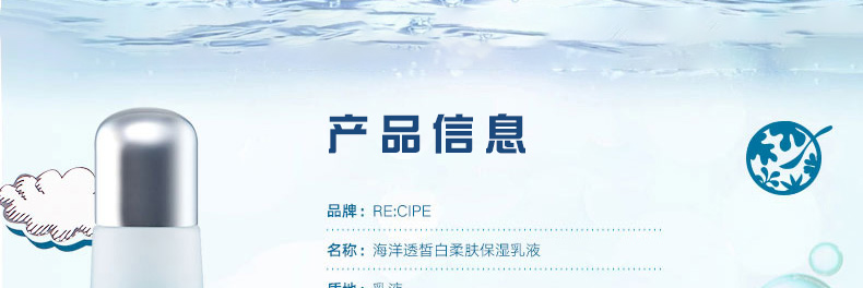 萊斯璧RE:CIPE海洋透皙白乳液保濕乳150ml 15秒解渴肌膚還你水嫩美肌—— 1、補水保濕,調節水油平衡。 2、任何肌膚,尤其適合干燥、粗糙膚質。 3、配合海洋透皙白護膚系列一起使用,效果更佳。 |