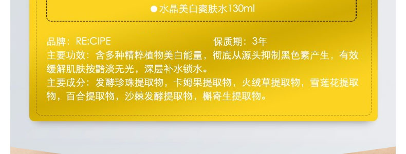 萊斯璧RE:CIPE水晶亮白爽膚水保濕水柔膚水130ml 讓你的肌膚白的徹底 潤的動人 |