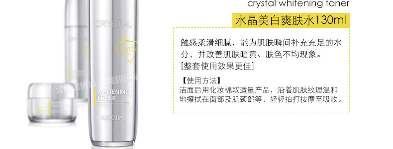 萊斯璧RE:CIPE水晶亮白爽膚水保濕水柔膚水130ml 讓你的肌膚白的徹底 潤的動人—— 1、美白提亮,補水保濕。 2、更適合肌膚粗糙、黯淡無光的MM使用。 3、配合水晶亮白護膚系列一起使用,效果更佳。 |