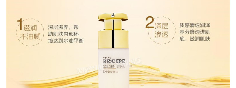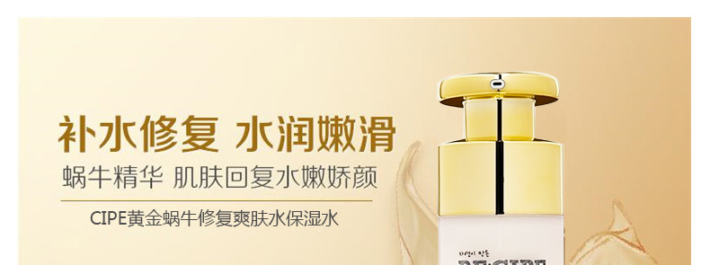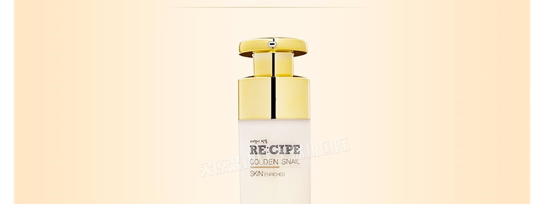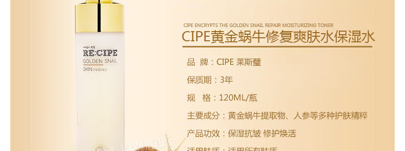 萊斯璧RE:CIPE黃金蝸牛修復爽膚水保濕水120ml 讓肌膚晶瑩透亮重回年輕彈力 —— 1、保濕抗皺,修護煥活,緩解過敏。 2、含黃金蝸牛提取物、人參等多種護膚精粹。 3、搭配黃金蝸牛修復乳液一起使用,效果更佳。 |