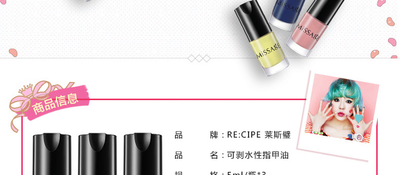 萊斯璧RE:CIPE可剝水性指甲油2號套裝5ml*3 粉嫩可愛風靡時尚美甲界 輕松撕剝隨時換色 |