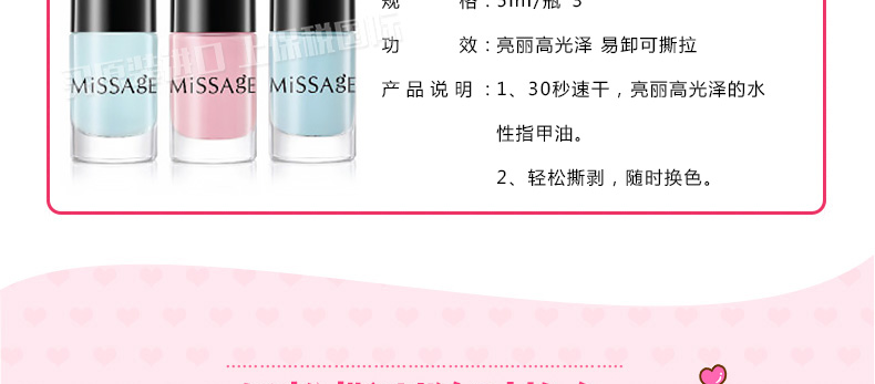 萊斯璧RE:CIPE可剝水性指甲油2號套裝5ml*3 粉嫩可愛風靡時尚美甲界 輕松撕剝隨時換色—— 1、5個色號組合套裝,任意選擇。 2、30秒速干,亮麗高光澤的水性指甲油。 3、輕松撕剝,隨時換色。 |