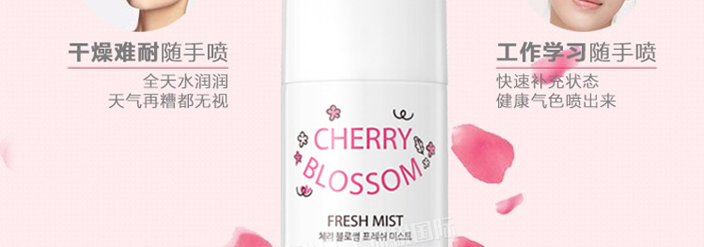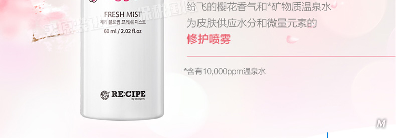 萊斯璧RE:CIPE櫻花修護噴霧櫻花隨身噴霧60ml 小巧玲瓏且大有可為—— 1、茉莉、玫瑰、櫻花和海洋等4種任你選。 2、便于攜帶,操作簡單,水霧輕盈細膩吸收快。 3、補水保濕定妝,舒緩修護。 |