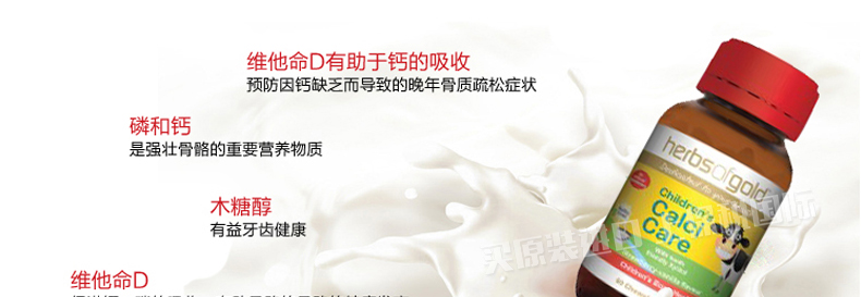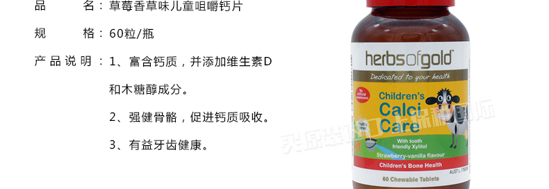 和麗康herbs of gold兒童鈣片草莓香草味咀嚼鈣片60粒 強壯寶寶每一天—— 1、富含鈣質,并添加維生素D和木糖醇成分。 2、強健骨骼,促進鈣質吸收。 3、有益牙齒健康。 |
