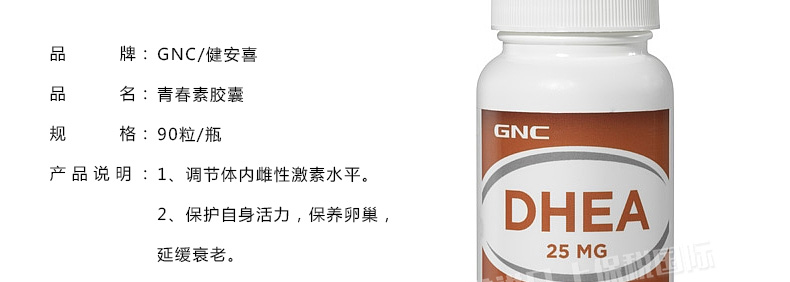 健安喜GNC青春素膠囊DHEA膠囊25mg 讓世界大一歲你卻年輕十歲90粒—— 1、調節體內雌性激素水平。 2、保養卵巢,延緩衰老。 3、提高受孕幾率。 |