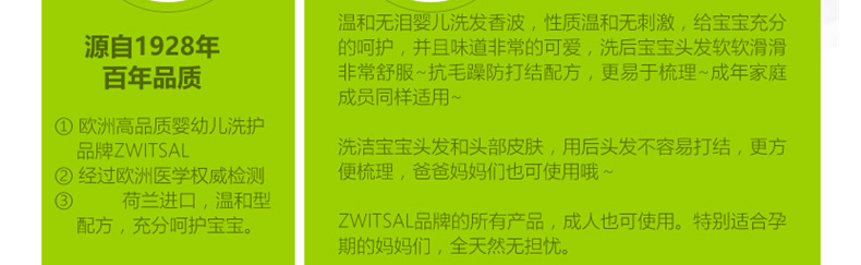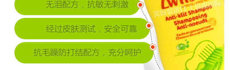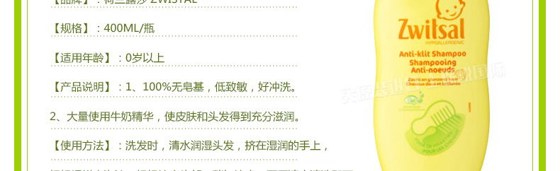 荷蘭露莎 Zwistal 嬰幼兒防打結(jié)洗發(fā)水 天然溫和無淚配方 兒童洗發(fā)香波400ML/瓶—— 1、無皂基,低致敏,好沖洗。 2、大量使用牛奶精華,使皮膚和頭發(fā)得到充分滋潤。 |