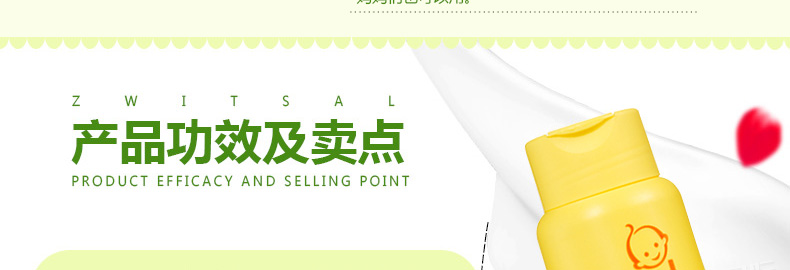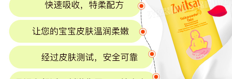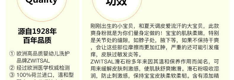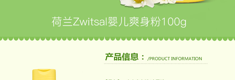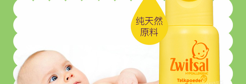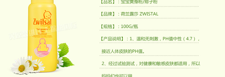 荷蘭露莎zwitsal 寶寶爽身粉/痱子粉 溫和安全防過敏100G/瓶—— 1、溫和無刺激,PH值中性(4.7),接近人體皮膚的ph值。 2、經過試驗測試,對健康和敏感皮膚都適用,所以媽媽們也可以用。 使用說明:早晚清潔后,取適量由內而外均勻擦拭于全臉 頸部 手部等。 |