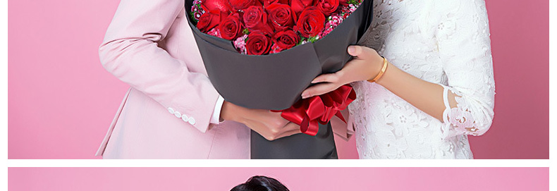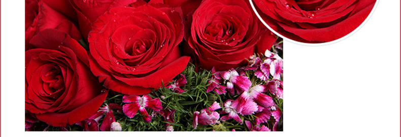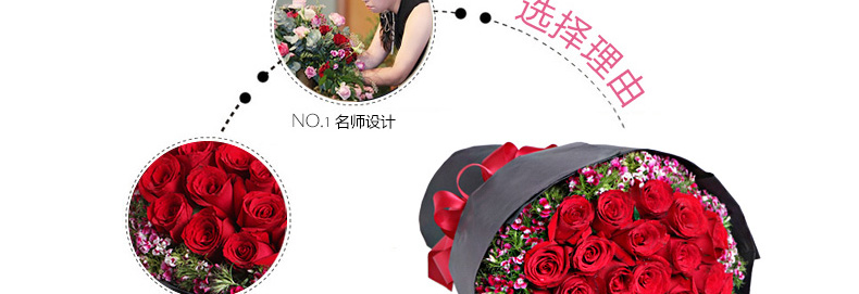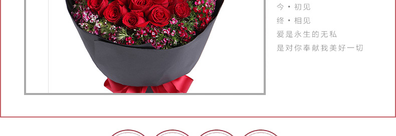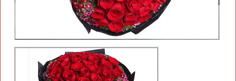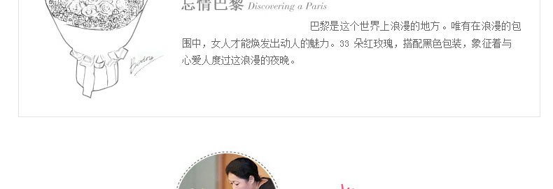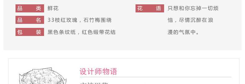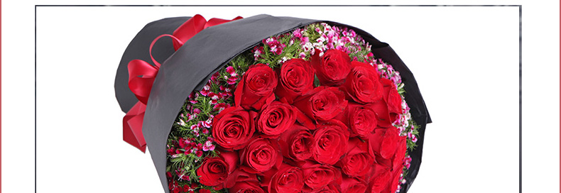 鮮花/忘情巴黎 33朵紅玫瑰+石竹梅—— 1、花材:33支紅玫瑰,石竹梅外圍豐滿搭配。 2、包裝:黑色條紋紙,紅色緞帶花結。 |