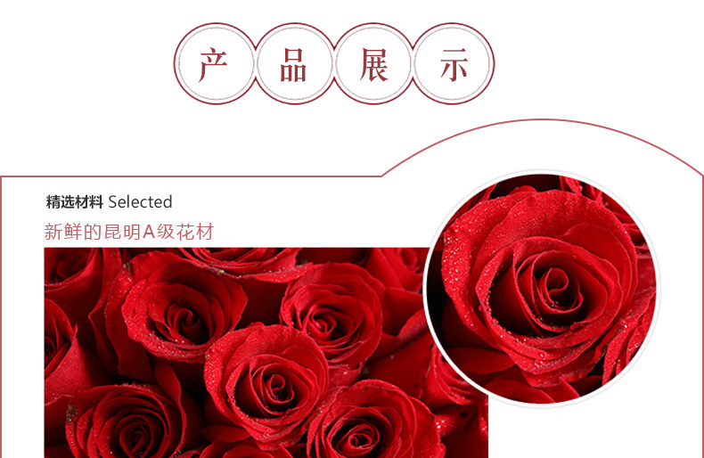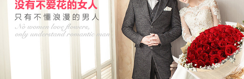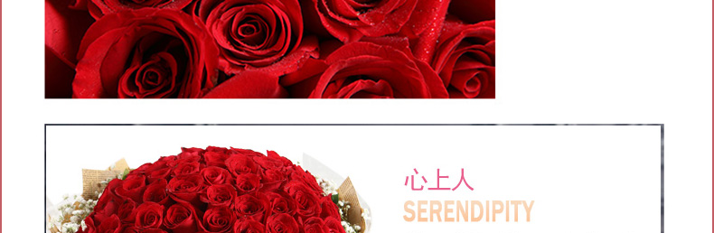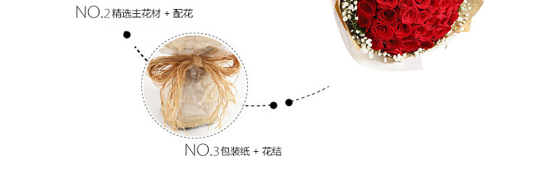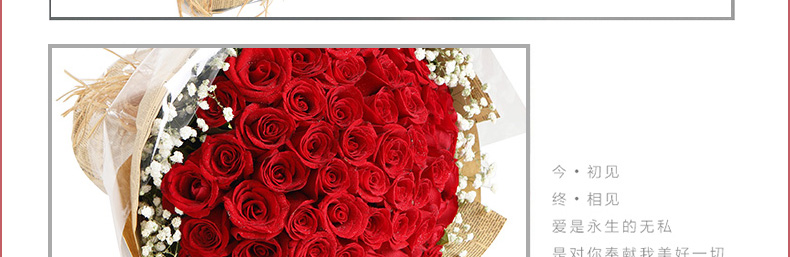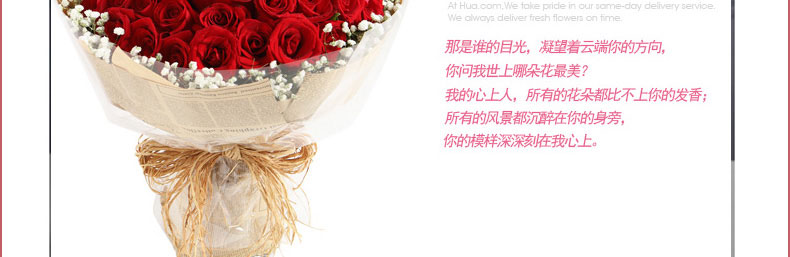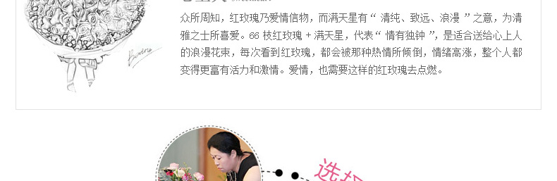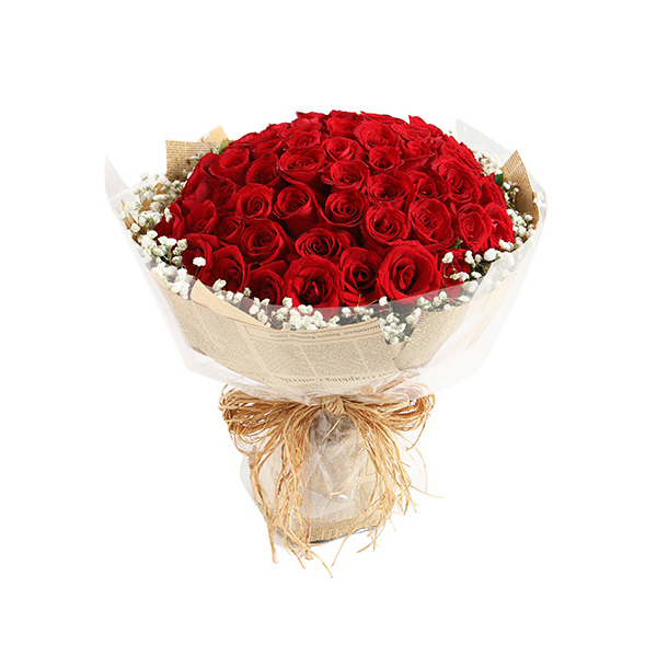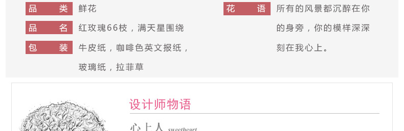 鮮花/心上人 66朵紅玫瑰+滿天星—— 1、花材:紅玫瑰66枝,滿天星圍繞。 2、包裝:牛皮紙,咖啡色英文報紙,玻璃紙,拉菲草。 |