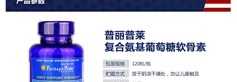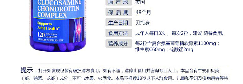 美國(guó) 普麗普萊(Puritan's Pride) 氨糖維骨力軟骨素膠囊 復(fù)合氨基葡萄糖軟骨素 潤(rùn)滑關(guān)節(jié)120粒/瓶—— 1、成人每日3次,每次2粒,隨餐服用。 2、高純度,吸收好,對(duì)腸胃無(wú)刺激。 3、每2粒含氨基葡萄糖軟骨素1100mg維生素C60mg硫酸錳2mg。 |