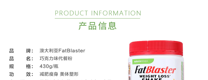 澳洲Fatblaster代餐奶昔 減肥瘦身 巧克力味代餐粉營養飽腹 430g/瓶—— 1、早餐2大勺奶昔+250毫升水、水果;中餐:2大勺奶昔+250毫升水、水果、湯;下午茶:2大勺奶昔+250毫升水、水果;晚餐:健康多蔬菜。 2、注意事項:15歲以下兒童不建議服用;孕婦禁用。 |
