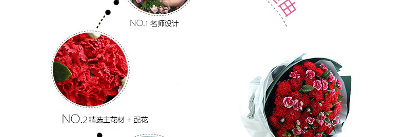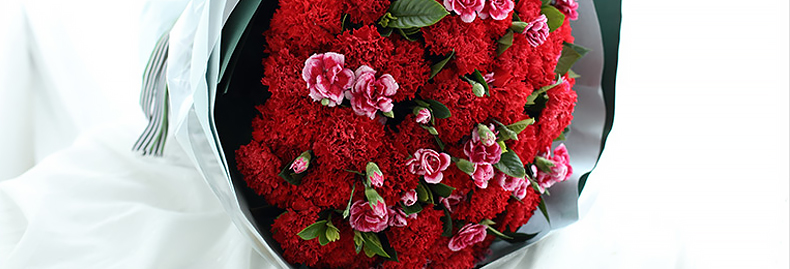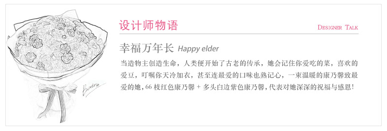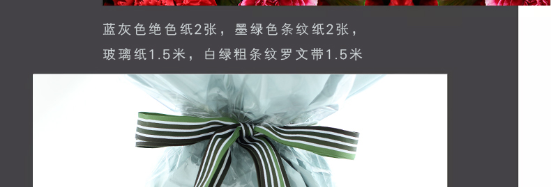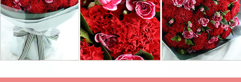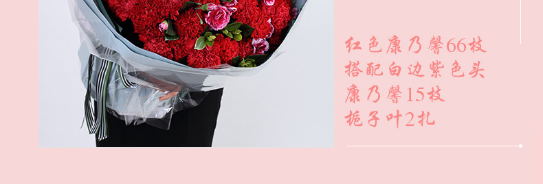 鮮花/幸福萬年長 66朵紅色康乃馨+白邊紫色多頭康乃馨15支+梔子葉2扎 母親節(jié)新品—— 1、花材66朵紅色康乃馨+白邊紫色康乃馨15支+梔子葉2扎。 2、包裝:藍(lán)灰色絕色紙2張,墨綠色條紋紙2張,玻璃紙1.5米,白綠粗條紋羅文帶1.5米。 |