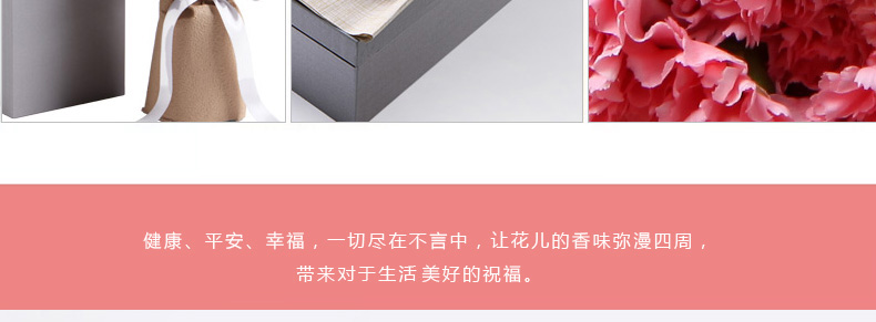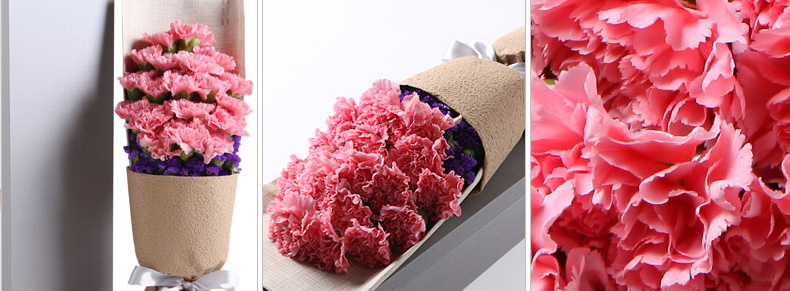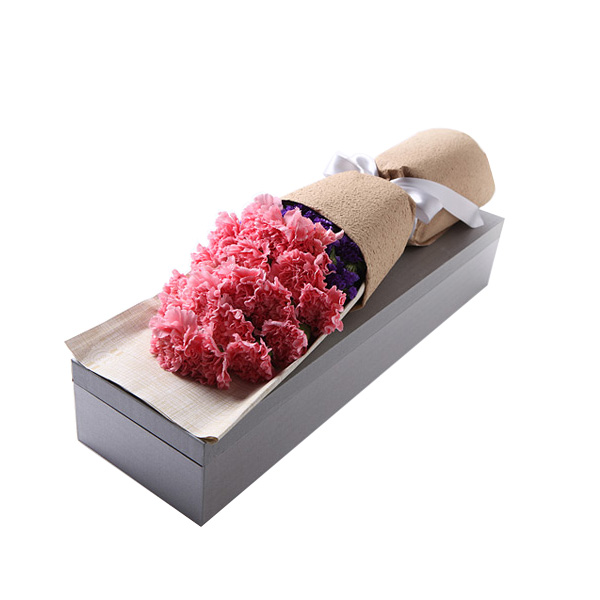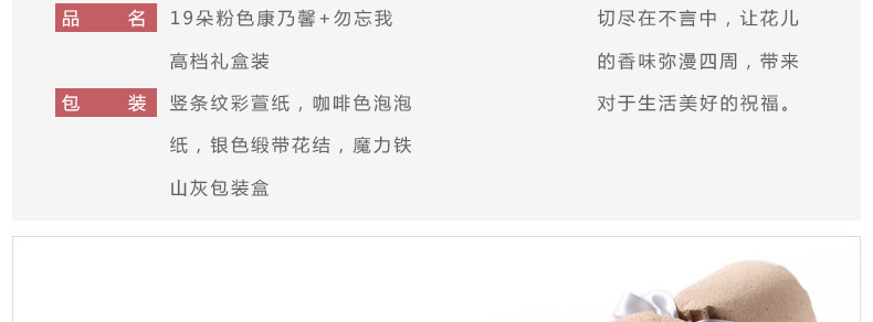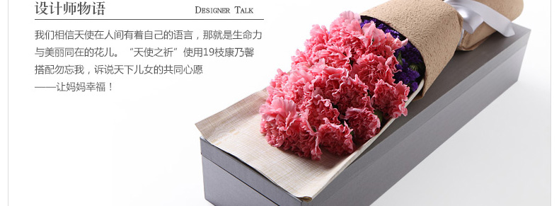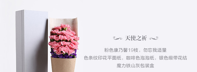 鮮花/天使之祁 19朵粉色康乃馨+勿忘我 禮盒裝—— 1、花材:粉色康乃馨19朵+勿忘我適量。 2、包裝:豎條紋彩萱紙,咖啡色泡泡紙,銀色緞帶花結,魔力鐵山灰包裝盒。 |