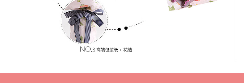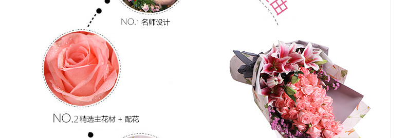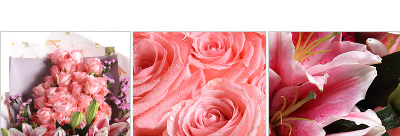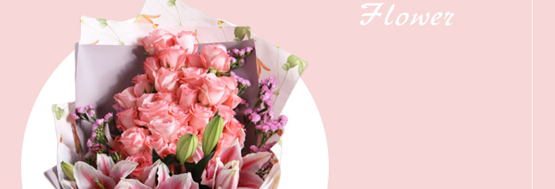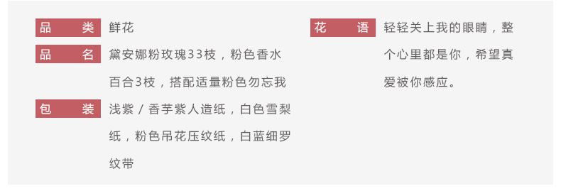 鮮花/甜蜜物語 33朵戴安娜粉玫瑰+3支粉色香水百合+粉色勿忘我—— 1、花材:黛安娜粉玫瑰33枝,粉色香水百合3枝,搭配適量粉色勿忘我。 2、包裝:淺紫/香芋紫人造紙,白色雪梨紙,粉色吊花壓紋紙,白藍細羅紋帶。 |