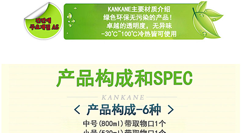 | 品 牌 | ? KANKANE | 規 格 | 中號 800ml * 1 小號 530ml * 1 迷你1號 232ml * 2 迷你2號115ml * 2 | |