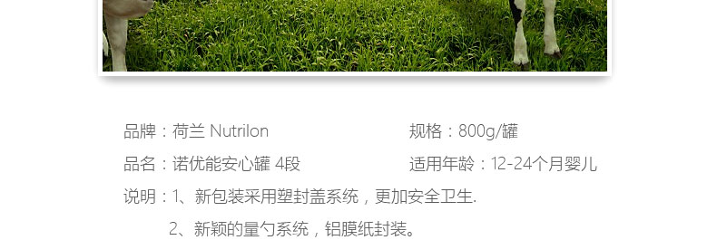 新品 荷蘭牛欄奶粉4段 Nutrilon諾優能安心罐 適用12-24個月嬰兒配方奶粉 原裝進口新包裝寶盒裝800g/罐—— 1、新包裝采用塑封蓋系統,更加安全衛生. 2、新穎的量勺系統,鋁膜紙封裝。 3、左右兩角平刮器設計,控制勺量,防止奶粉灑落。 |