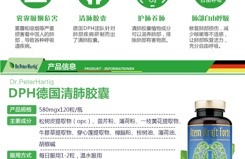 直郵德國DPH Dr.Peter Hartig清肺膠囊120粒 潤肺養肺祛痰 |