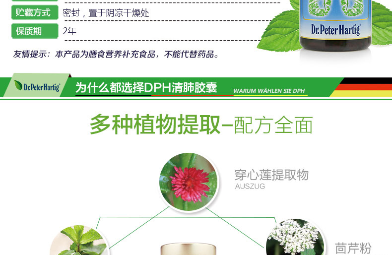 直郵德國DPH Dr.Peter Hartig清肺膠囊120粒 潤肺養肺祛痰—— 1、含有松樹皮、薄荷粉、穿心蓮等植物提取精粹。 2、清肺祛痰、緩解咳嗽。 3、抵抗霧霾、凈化呼吸系統。 |