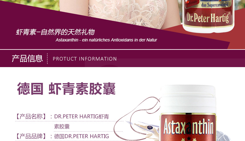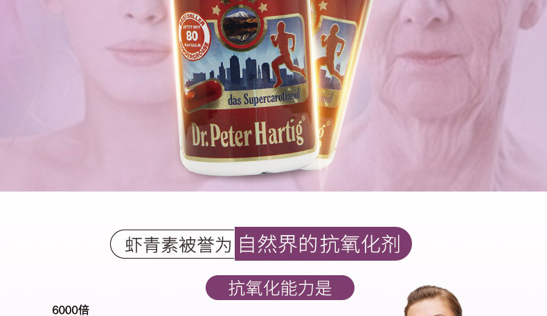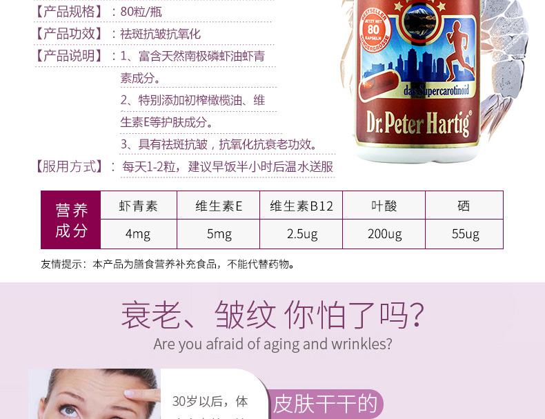 直郵德國DPH Dr.Peter Hartig蝦青素膠囊80粒 南極磷蝦油蝦青素 祛斑抗皺抗氧化—— 1、富含天然南極磷蝦油蝦青素成分。 2、特別添加初榨橄欖油、維生素E等護膚成分。 3、具有祛斑抗皺,抗氧化抗衰老功效。 |