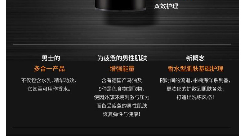 九朵云 格麗松男士多效潤膚精華110ML 滋養保濕增強肌膚活力 還能做香水使用—— 1、含黑莓、黑豆等9種黑色食物提取物。 2、滋養保濕,令疲憊肌膚恢復彈力與活力。 3、柑橘海洋的淡雅香氣,幽遠清揚。 |