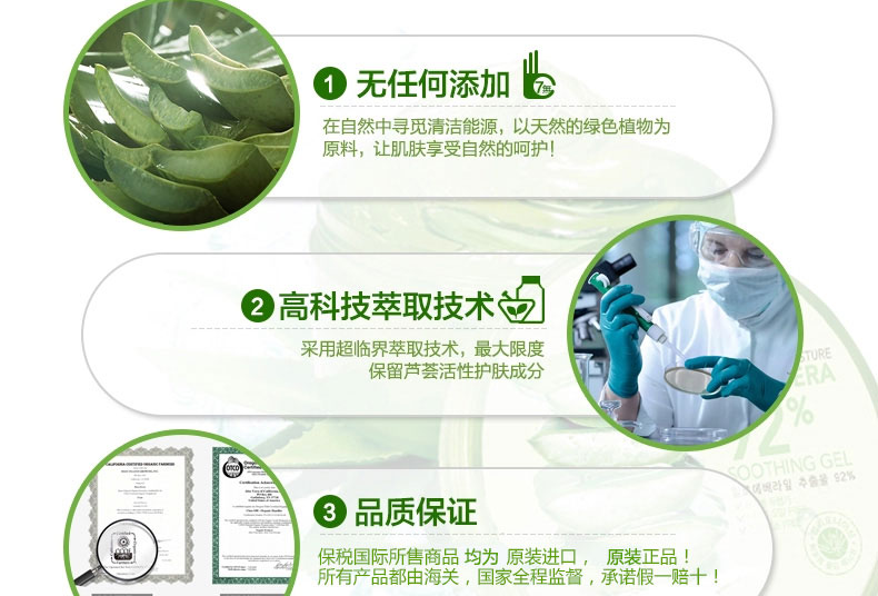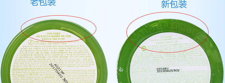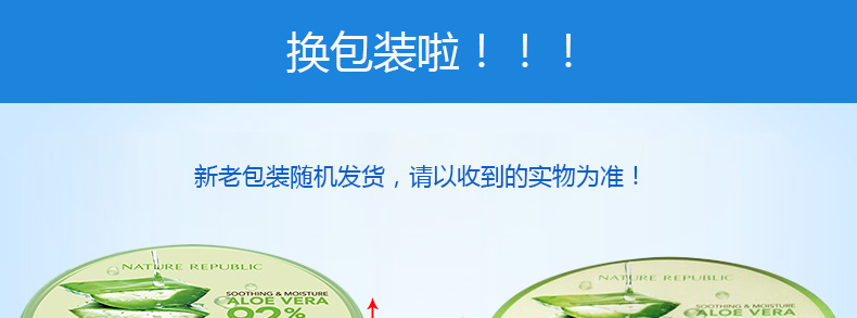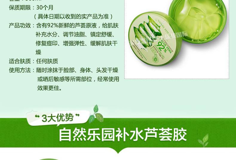 3盒裝 韓國原裝進口NatureRepublic/自然樂園補水蘆薈膠曬后修復(fù)蘆薈祛痘300ml/盒—— 1、富含92%的蘆薈精華,幫助解決多種肌膚問題
