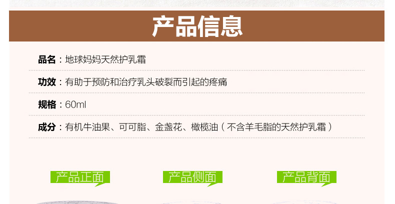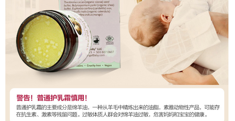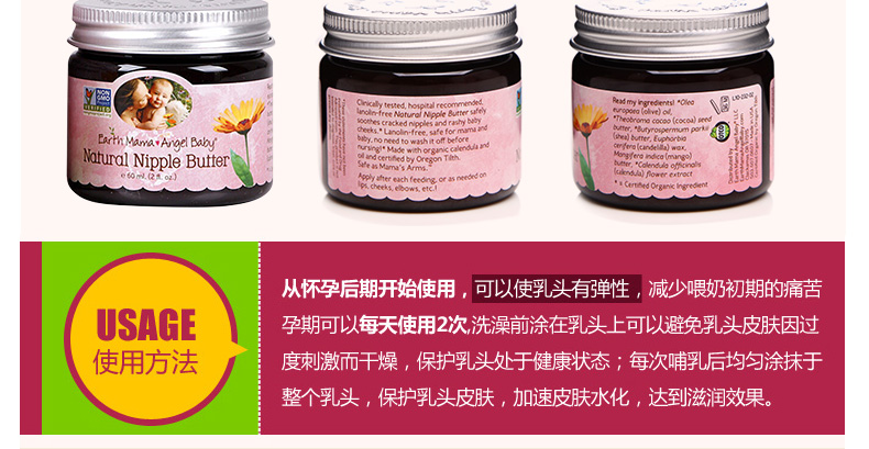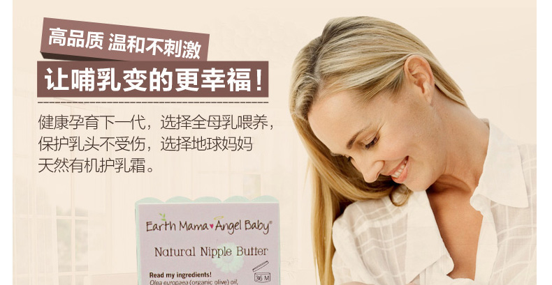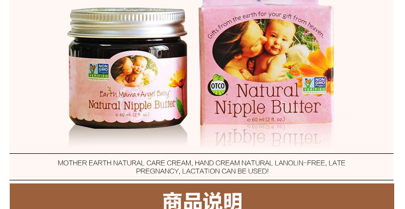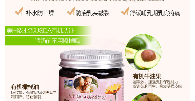 地球媽媽天使寶貝Earth Mama Angel Baby護乳霜護乳黃油乳頭修護霜60ML 預防并緩解乳頭破裂的疼痛—— 1、含金盞草、可可粉、黃油、印度黃油等天然安全成分。 2、預防和緩解乳頭破裂而引起的疼痛。 3、無臭安全,寶寶喂奶前也不需要擦掉。 |