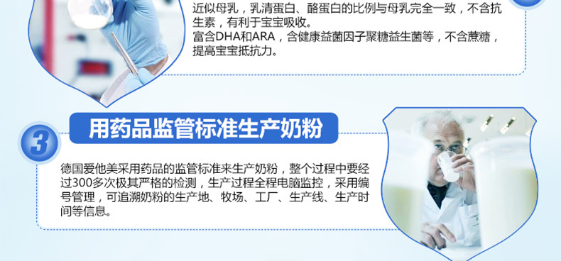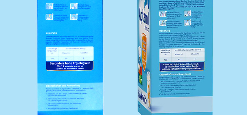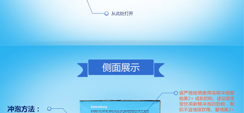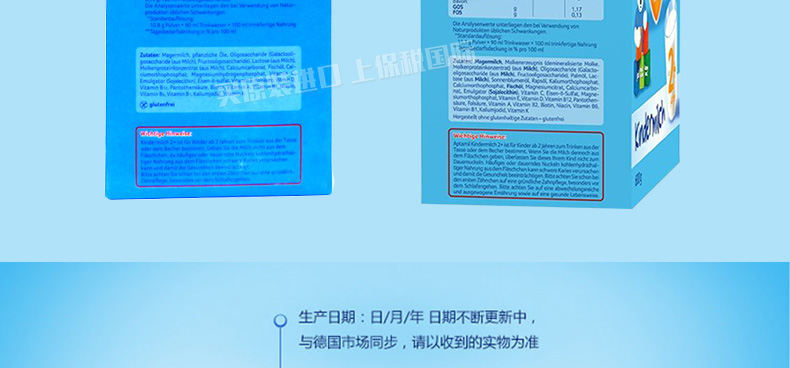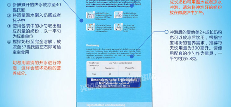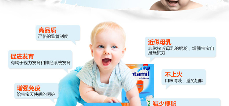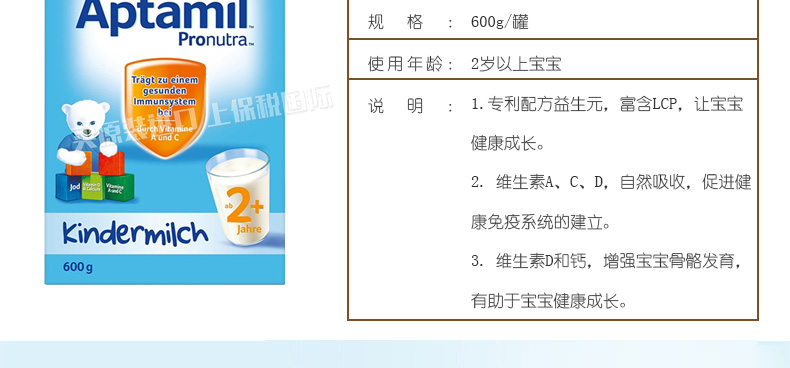 6罐裝德國原裝進口 美樂寶 Aptamil愛他美2+奶粉 2歲以上寶寶 600g/罐—— 1. 愛他美奶粉,近似母乳的專利奶粉,媽媽的愛。 2. 專利配方益生元,富含LCP,讓寶寶健康成長。 3. 維生素A、C、D,自然吸收,促進健康免疫系統的建立。 4. 維生素D和鈣,增強寶寶骨骼發育,有助于寶寶健康成長。 5. 適量減少蛋白質的含量,含專利益生元配方(GOS/FOS)。 6. 含較少的脂肪和蛋白,防止奶胖。 注:奶粉包裝更新換代頻繁,請以收到實物為準。 |