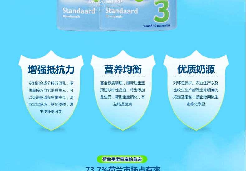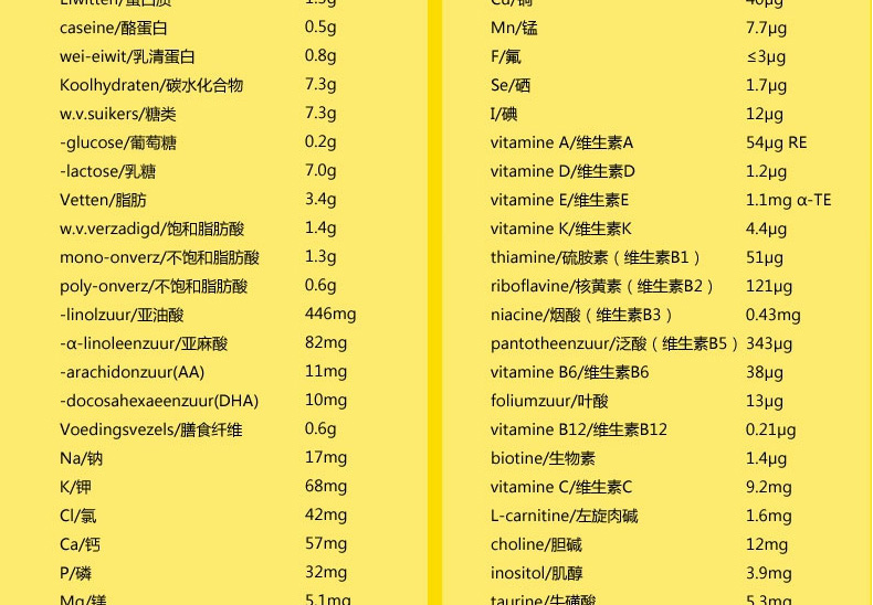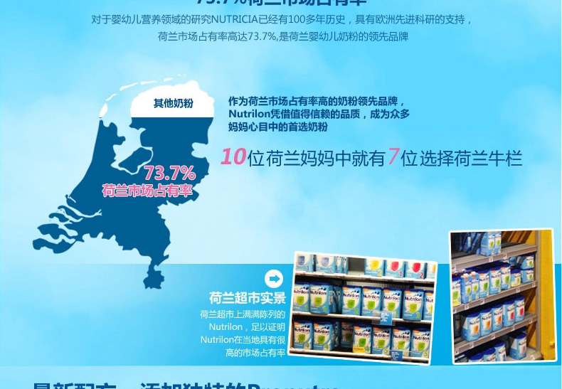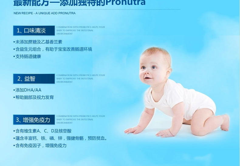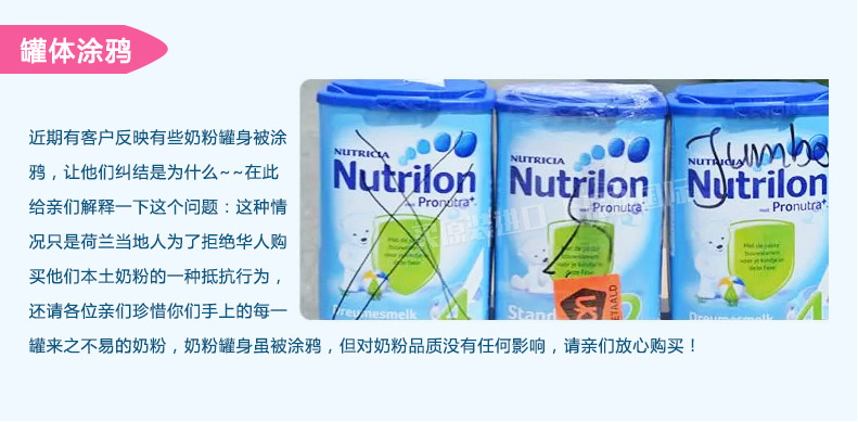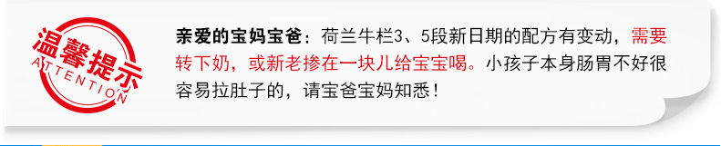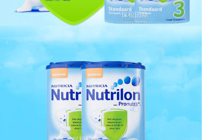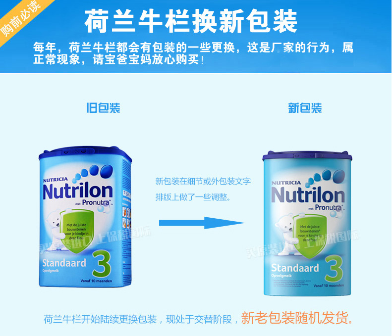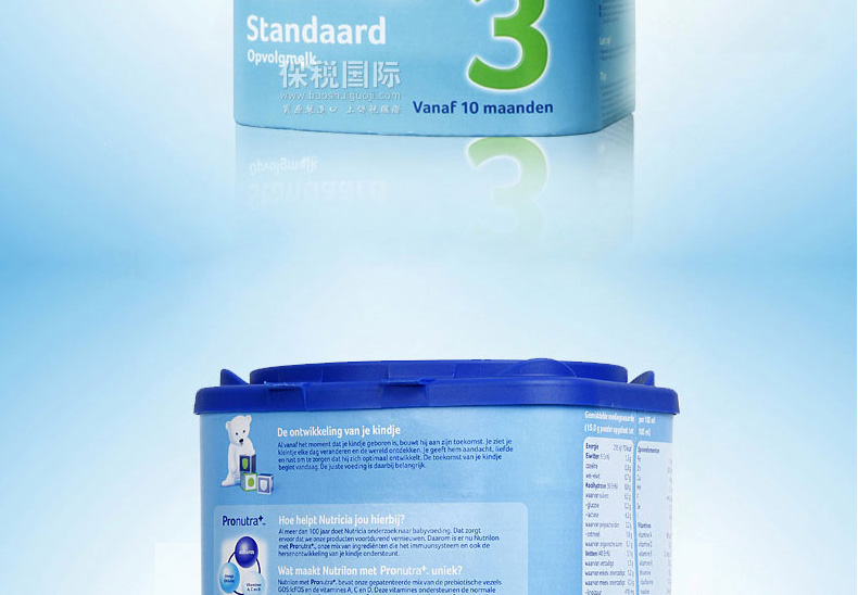 6罐裝荷蘭原裝進口 Nutrilon牛欄本土嬰兒奶粉3段 營養全面 香醇可口 800g/罐—— 1.接近母乳的奶粉,口味清淡,含益生元組合,未添加蔗糖和乙基香蘭素,有助于改善腸道。 2.添加DHAAA幫助腦部及視力發育,健康益智。 3.含有維生素A,C,D及核苷酸,有助于骨骼增長,增強免疫力。 4.蘊含豐富的鈣和磷,鐵質,蛋白質和鹽,增強抵抗力,幫助寶寶腦部及視力的發育。 注:奶粉包裝更新換代頻繁,請以收到實物為準。 |