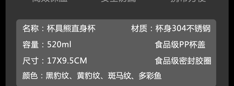 杯具熊Beddy Bear燜燒罐燜燒杯保溫飯盒保溫桶520ML 4種款式任選—— 1、白豹紋、黑豹紋、斑馬紋、多彩魚等4款任選。 2、8層精密工藝的高質量燜燒罐。 3、24小時突破性溫控,氣密性防漏設計。 |