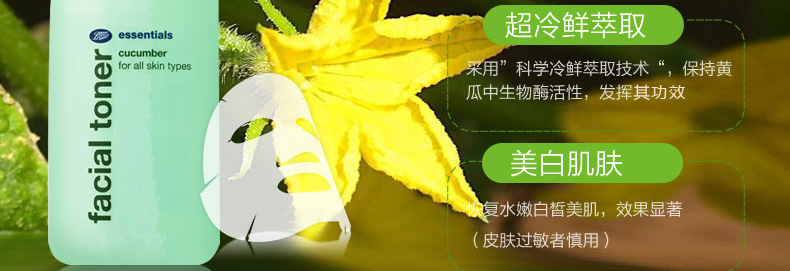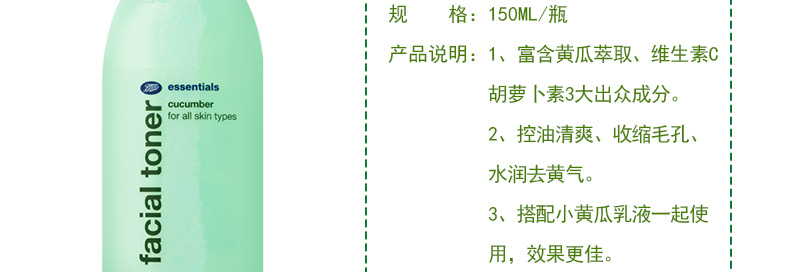 博姿Boots小黃瓜爽膚水150ML 補水保濕控油清爽收縮毛孔 一瓶/兩瓶—— 1、富含黃瓜萃取、維生素C、胡蘿卜素3大出眾成分。 2、控油清爽、收縮毛孔、水潤去黃氣。 3、搭配小黃瓜乳液一起使用,效果更佳。 |