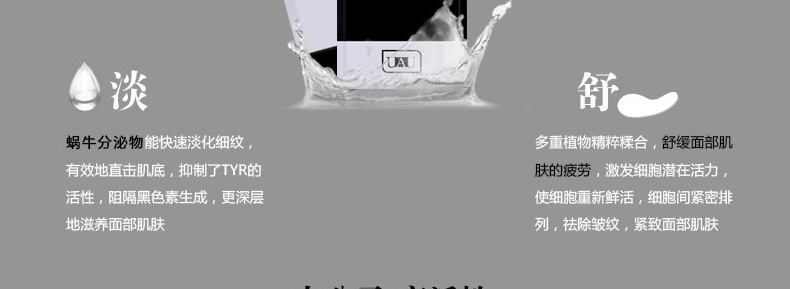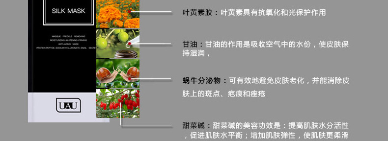 泰國(guó)uau蠶絲面膜黑色/白色蠶絲面膜10片 美白提亮修復(fù)祛痘 清潔補(bǔ)水嫩膚抗皺—— 1、含尿囊素、蝸牛分泌液、甜菜堿等有效成分。 2、黑色:祛痘修復(fù),提亮膚色。 3、白色:清潔補(bǔ)水,嫩膚抗皺。 |