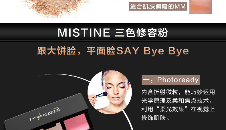 泰國Mistine美氏婷三色修容粉4.8g 修容遮瑕秒變V型臉 粉色/橘色—— 1、粉色更適合膚色偏白的MM。 2、橘色更適合膚色偏暗的MM。 3、修容遮瑕,秒變V型臉。 |