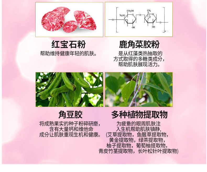韓國IYOUB保加利亞玫瑰眼膜貼60片粉色眼膜 保濕彈力光滑提亮—— 1、保濕滋潤,增強彈力,光滑肌膚,提亮膚色。 2、含有大馬士革玫瑰、薔薇、紅寶石粉、角豆膠等成分。 3、還有黑珍珠、綠藻、乳木果、燕窩和黃金等5種任選。 |
