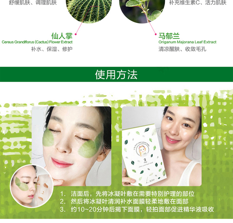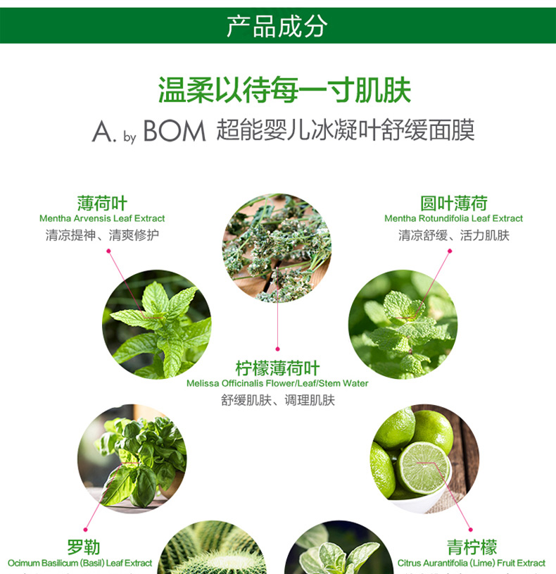 1、富含多種綠色植物精粹,溫和零刺激。 2、添加冰凝葉片,舒緩敏感肌膚。 3、補水保濕,平衡修護。 |