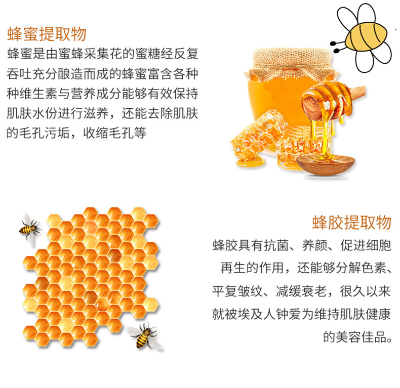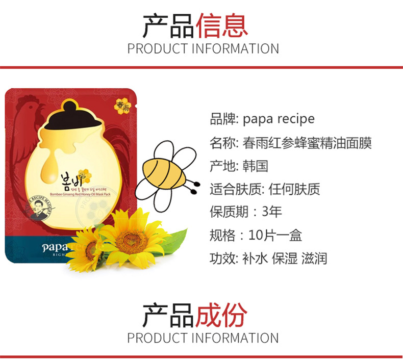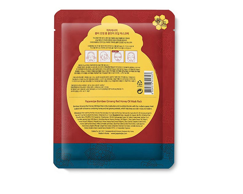 1、含有紅參提取物、蜂蜜、玫瑰果油、山茶果油等成分。 2、天然韓紙面膜布,精華營養更易吸收 2、滋養保濕,彈力舒緩。 |