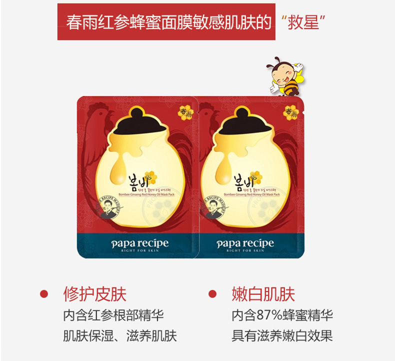 春雨papa recipe紅參面膜10片蜂蜜紅參面膜 滋養保濕彈力舒緩 |