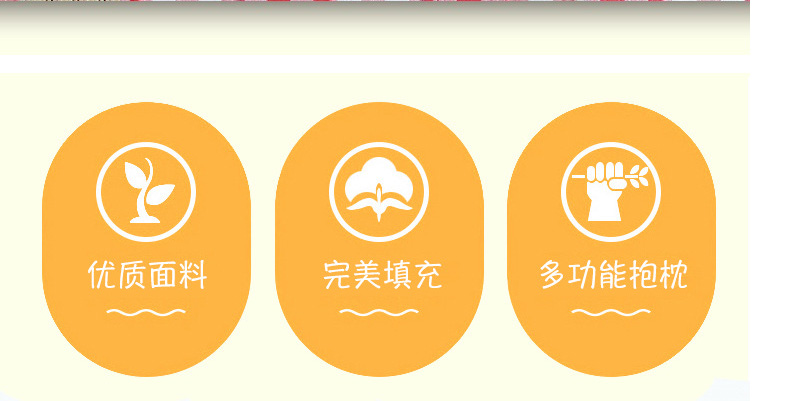 1、優(yōu)質(zhì)面料。 2、完美填充。 3、多功能抱枕。 |