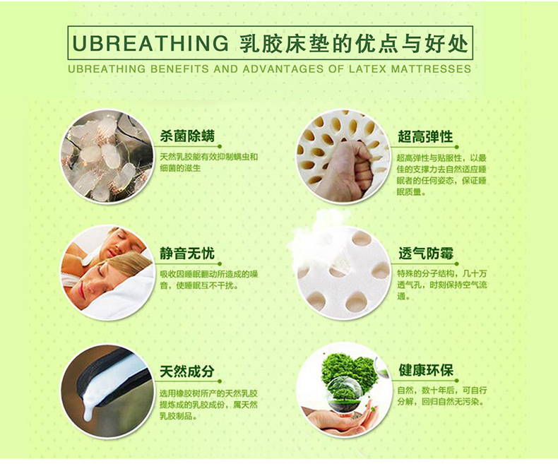 1、天然透氣,柔軟有彈性。 2、有效預潮防熱,不易變形。 3、乳膠蛋白分子有效抑制防螨。 |