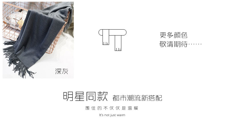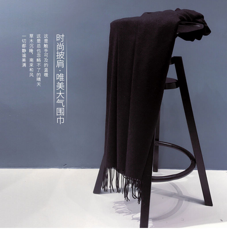 1、羊毛圍巾,舒適溫暖。 2、尺寸200*70cm,加大加寬,亦可做披肩用。 3、純色系列,簡(jiǎn)單不失大氣。 |