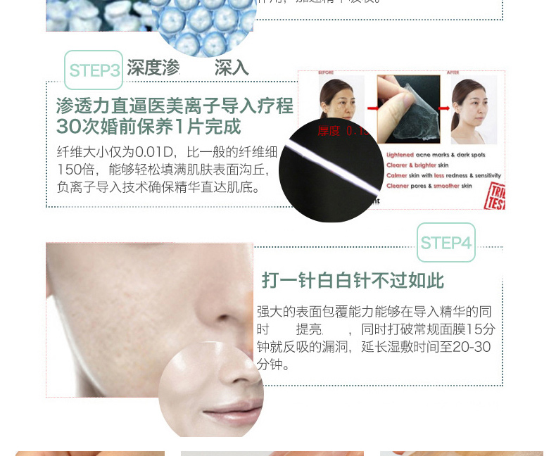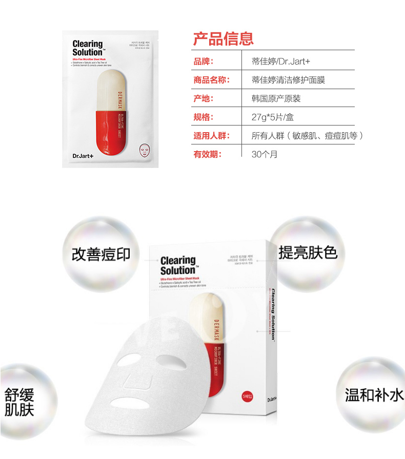 1、三種具有潔膚鎮靜功效的優質原料合理配比。 2、有效緩解肌膚困擾、改善膚色&膚質。 3、超細纖維材質面膜纖維,與面部完美貼合。 |