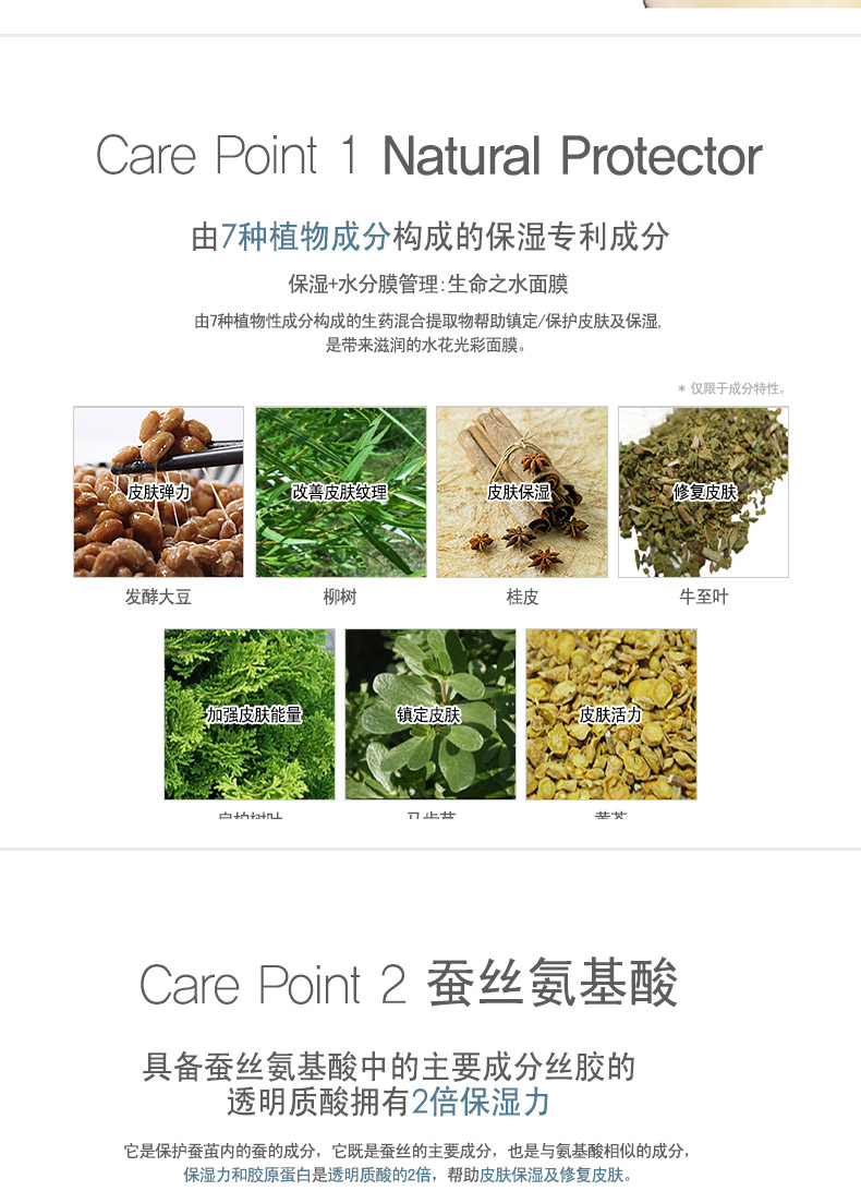 1、雙重美白管理+賦予天然能量。 2、緊貼力優秀即刻提亮。 3、美白光彩帶來的滋潤使用感。 |