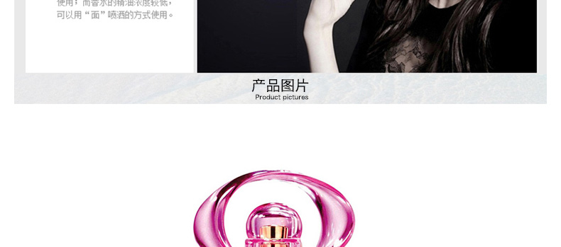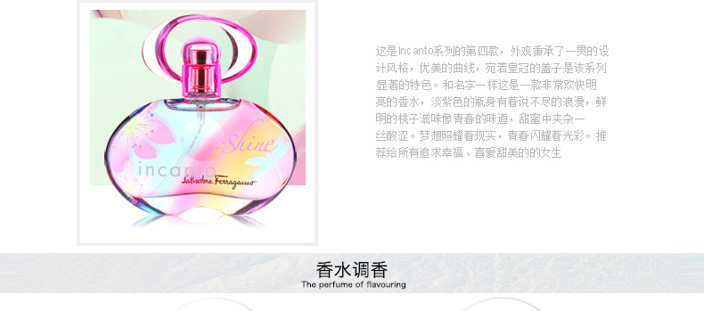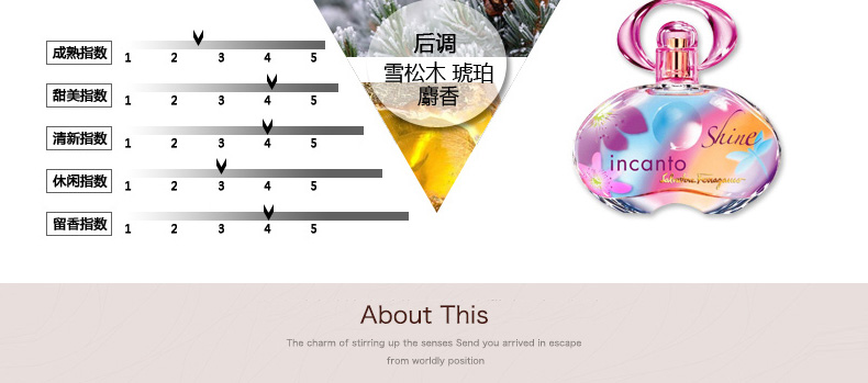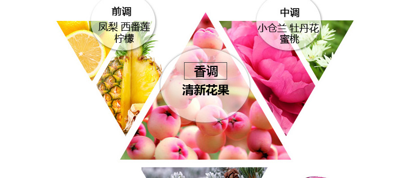 1、香調:清新花果香調; 2、前調:菠蘿、百香果、佛手柑; 3、中調:小蒼蘭、粉紅牡丹、桃子; 4、后調:雪松木、琥珀、麝香。 5、適合對像:青春、甜美、可愛、時尚的MM使用 |