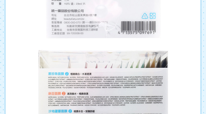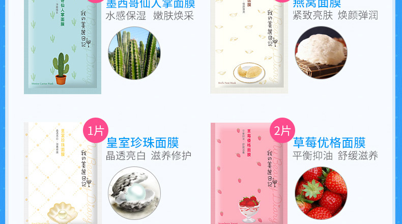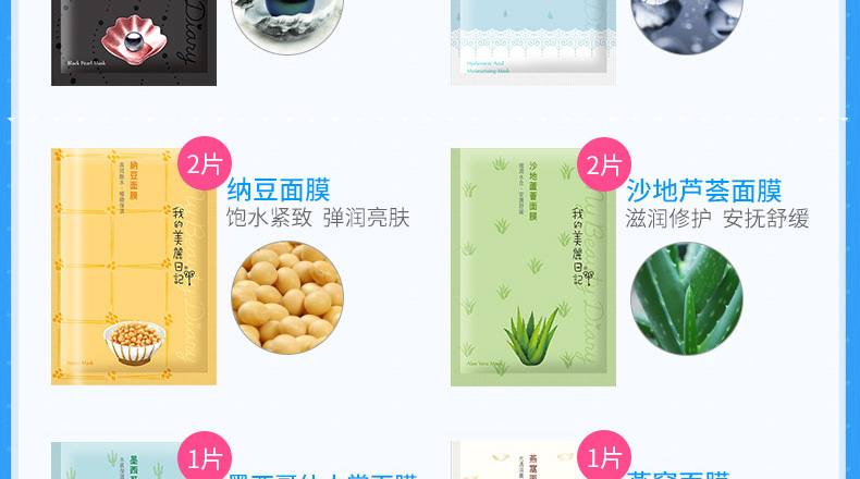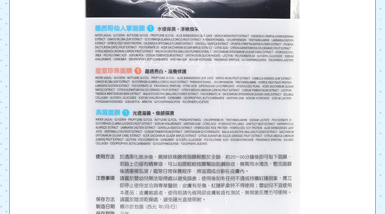 黑珍珠*2、玻尿酸*1、納豆*2、沙地蘆薈*2、仙人掌*1、燕窩*1、珍珠*1、草莓*2、膠原蛋白*2、紅酒*2 |