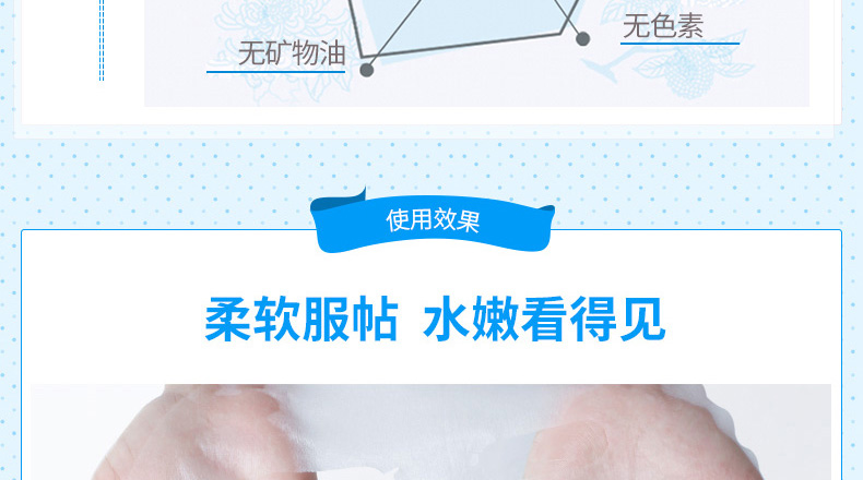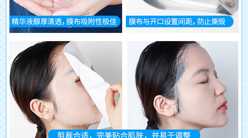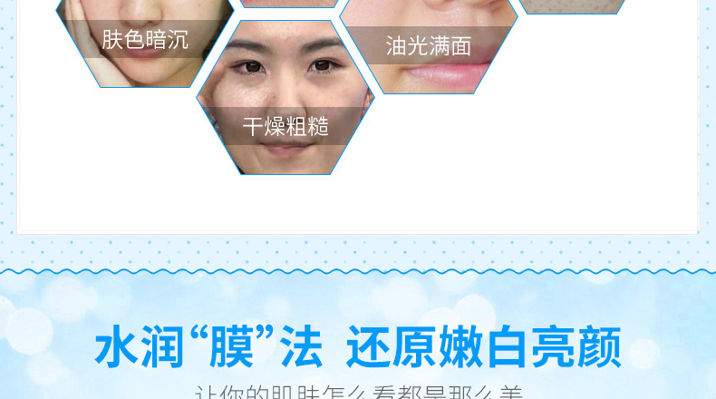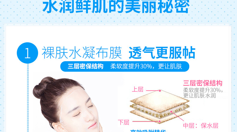 1、極絲裸膚水凝布膜透氣更膜貼; 2、雙效保濕成分更加水潤保濕; 3、多重搭配,從內而外一次滿足肌膚需求。 |