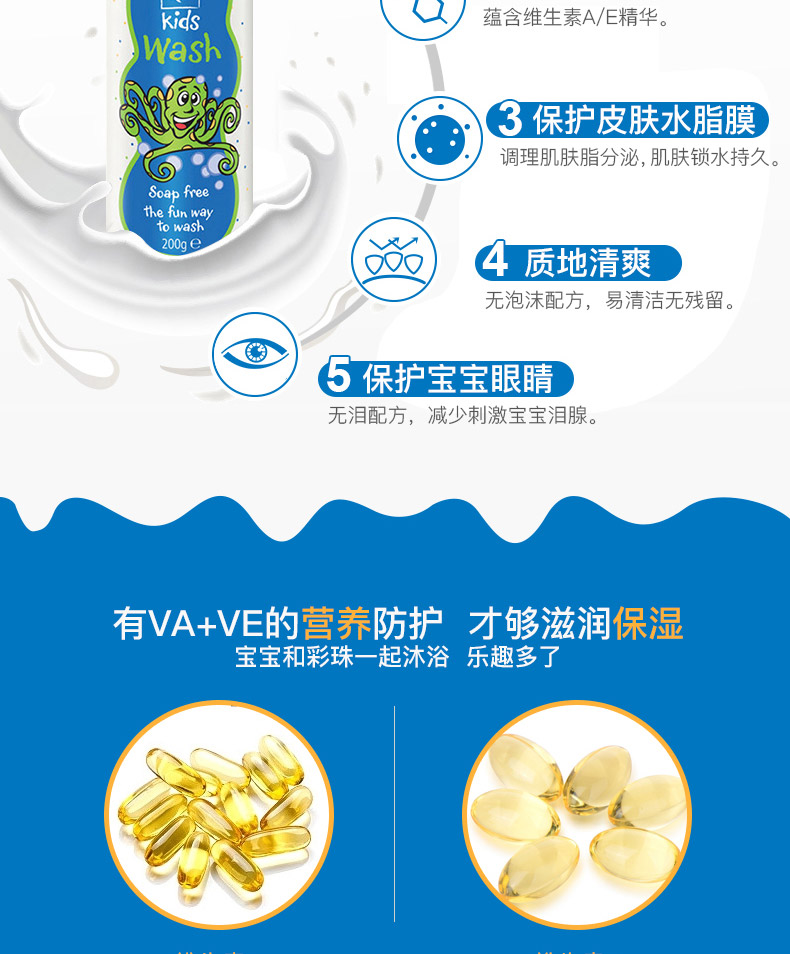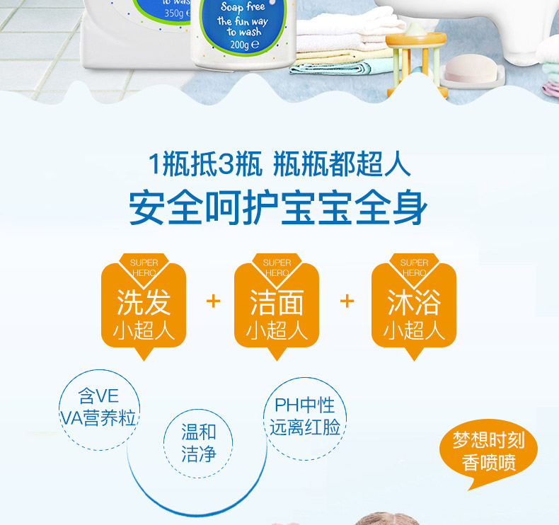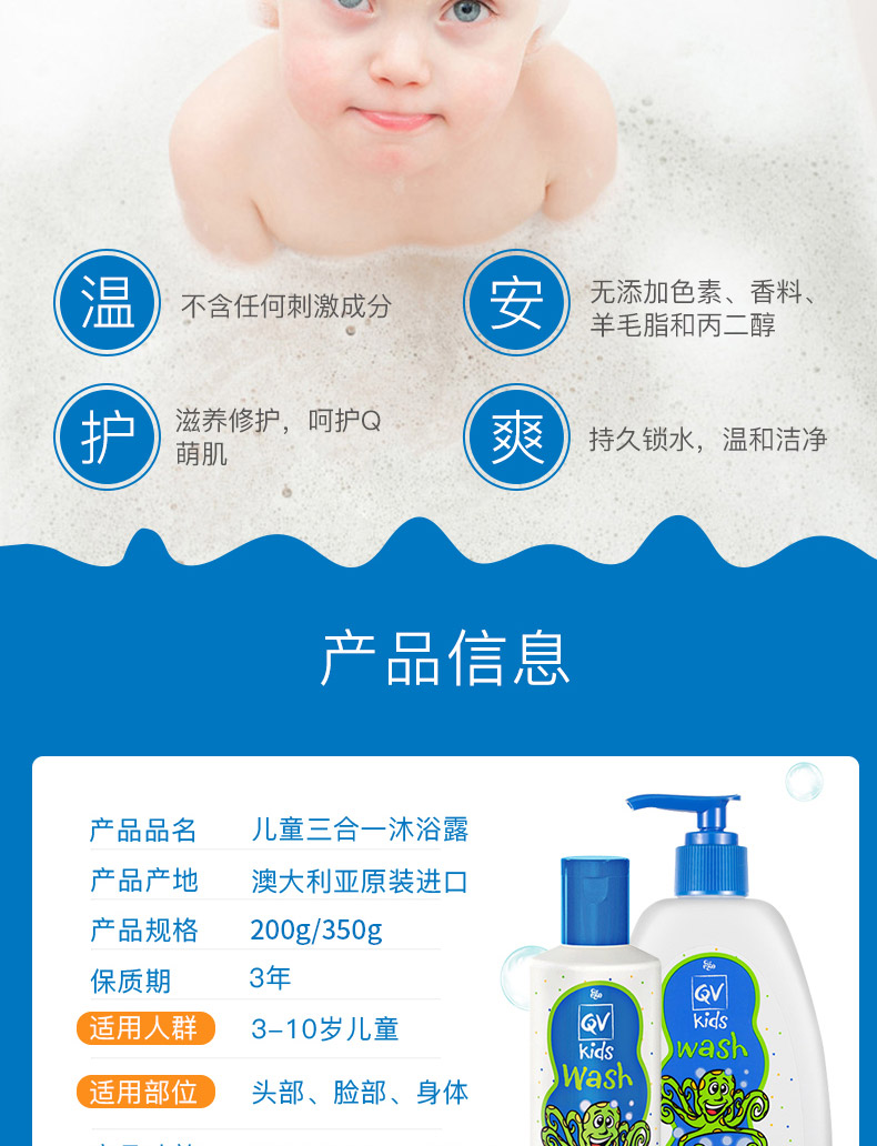 1、溫和清潔去垢,凈護全身。 2、無皂低沫配方,多效防護。 3、潔面、洗發、沐浴、三合一。 |