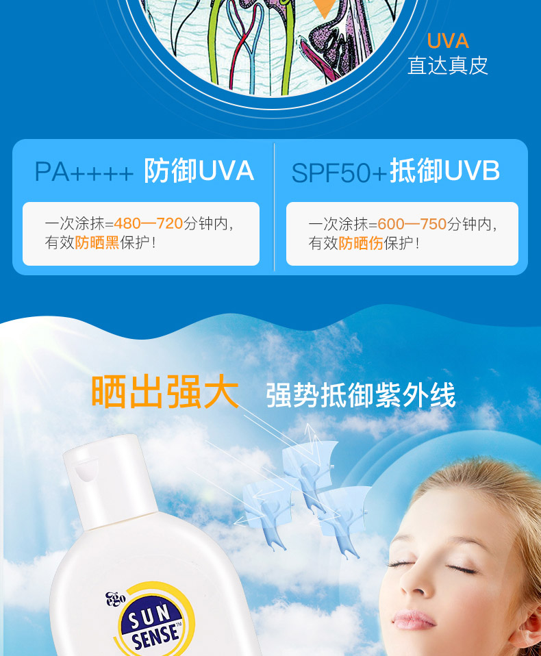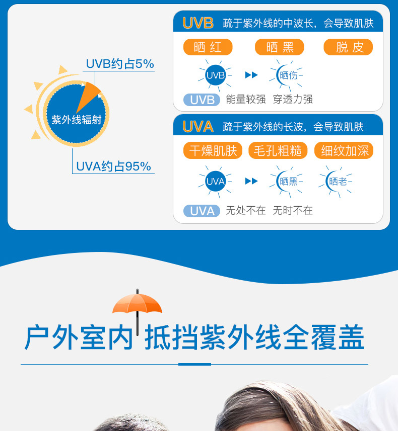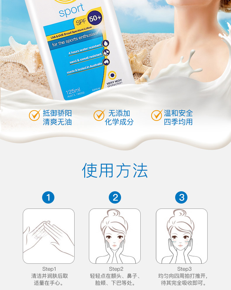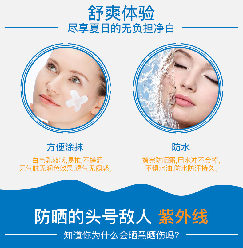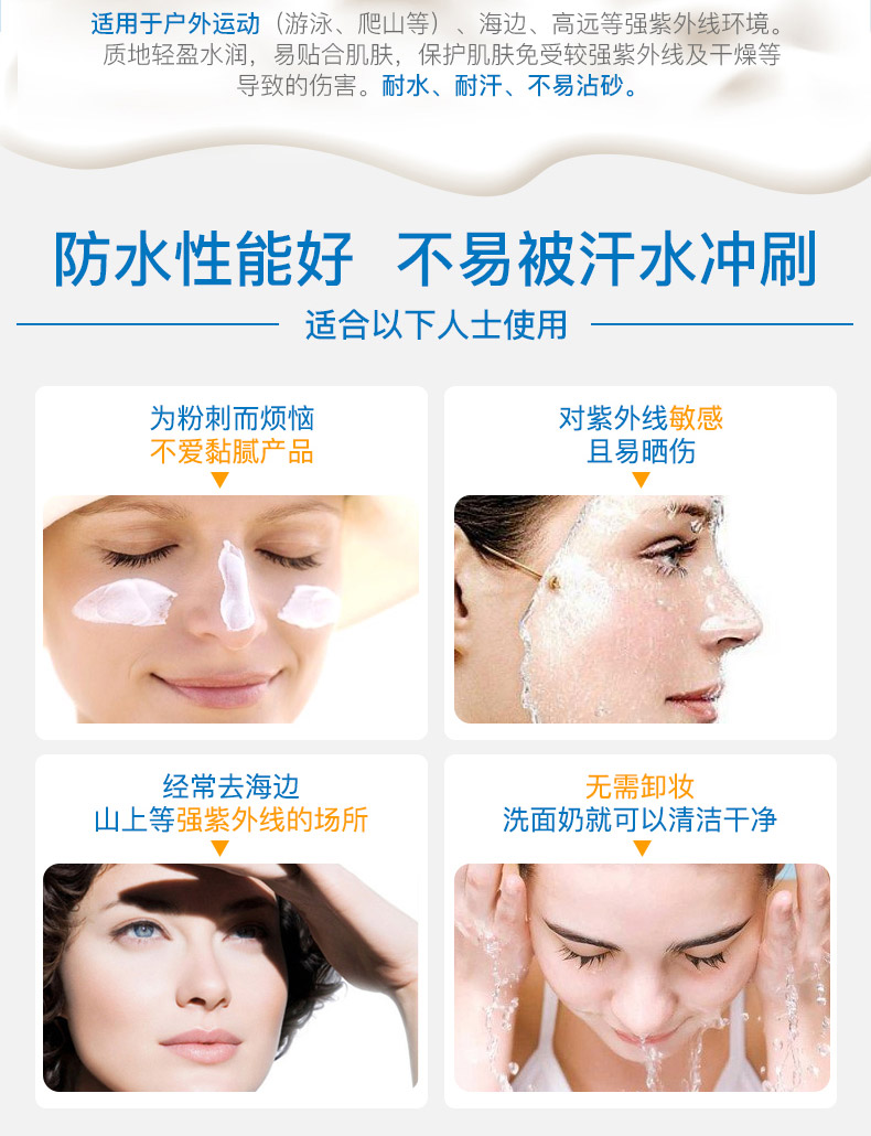1、輕薄透氣,不油膩。 2、曬后修復,鎮靜舒緩。 3、無香料,不含敏感成分,防水防汗,運動型防曬。 |